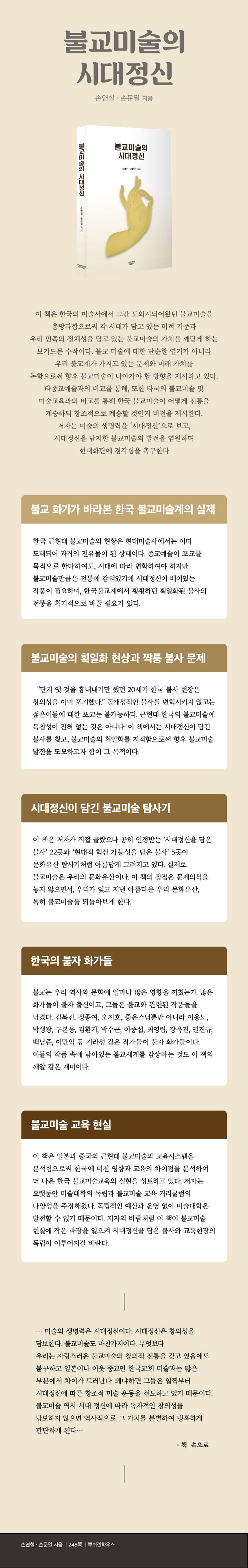 이 책은 한국의 미술사에서 그간 도외시되어왔던 불교미술을 총망라함으로써 각 시대가 담고 있는 미적 기준과 우리 민족의 정체성을 담고 있는 불교미술의 가치를 깨닫게 하는 보기드문 수작이다. 불교미술에 대한 단순한 열거가 아니라 우리 불교계가 가지고 있는 문제와 미래 가치를 논함으로써 향후 불교미술이 나아가야 할 방향을 제시하고 있다. 타종교예술과의 비교를 통해, 또한 타국의 불교미술 및 미술교육과의 비교를 통해 한국 불교미술이 어떻게 전통을 계승하되 창조적으로 계승할 것인지 비전을 제시한다. 저자는 미술의 생명력을 ‘시대정신’으로 보고, 시대정신을 담지한 불교미술의 발전을 염원하며 현대화단에 경각심을 촉구한다.
